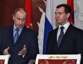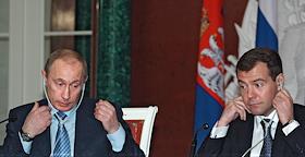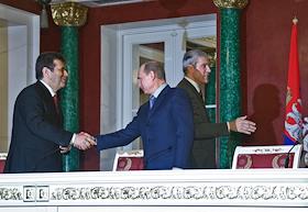 Президент России Владимир Путин (слева) и первый заместитель председателя Правительства России Дмитрий Медведев (второй справа) во время деловой встречи в Кремле с президентом Сербии Борисом Тадичем и председателем Правительства Сербии Воиславом Коштуницей. Россия и Сербия заключили стратегическое межправительственное соглашение в нефтегазовой сфере сроком на 30 лет. В присутствии президентов двух стран документ подписали министр промышленности и энергетики России Виктор Христенко (второй слева) и министр по инфраструктуре Сербии Велимир Илич.