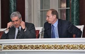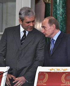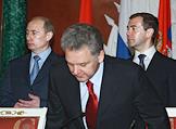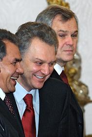 Посол России в Сербии Александр Алексеев (справа), министр промышленности и энергетики России Виктор Христенко (в центре) и министр России по делам гражданской обороны, чрезвычайным ситуациям и ликвидации последствий стихийных бедствий Сергей Шойгу (слева) во время деловой встречи Президента России Владимира Путина с президентом Сербии Борисом Тадичем в Кремле. Темы встречи - проблема Косово, вопросы сотрудничества на международной арене, обмен мнениями по всему комплексу двусторонних отношений.