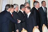 Министр иностранных дел России Сергей Лавров (справа), посол России в Сербии Александр Алексеев (второй справа), первый заместитель председателя Правительства России Дмитрий Медведев (в центре), министр России по делам гражданской обороны, чрезвычайным ситуациям и ликвидации последствий стихийных бедствий Сергей Шойгу (четвертый слева), полномочный представитель Президента России в Центральном федеральном округе Григорий Полтавченко (третий слева), глава РАО "Газпром" Алексей Миллер (второй слева) и президент ОАО "Газпромнефть" Александр Дюков (слева) во время деловой встречи Президента России Владимира Путина с президентом Сербии Борисом Тадичем в Кремле. Темы встречи - проблема Косово, вопросы сотрудничества на международной арене, обмен мнениями по всему комплексу двусторонних отношений.