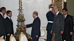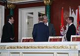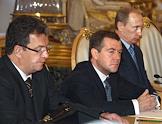 Министр иностранных дел России Сергей Лавров (справа), посол России в Сербии Александр Алексеев (второй справа), первый заместитель председателя Правительства России Дмитрий Медведев (в центре), министр России по делам гражданской обороны, чрезвычайным ситуациям и ликвидации последствий стихийных бедствий Сергей Шойгу (четвертый слева), полномочный представитель Президента России в Центральном федеральном округе Григорий Полтавченко (третий слева), глава РАО "Газпром" Алексей Миллер (второй слева) и президент ОАО "Газпромнефть" Александр Дюков (слева) во время деловой встречи Президента России Владимира Путина с президентом Сербии Борисом Тадичем в Кремле. Темы встречи - проблема Косово, вопросы сотрудничества на международной арене, обмен мнениями по всему комплексу двусторонних отношений.