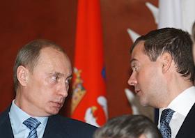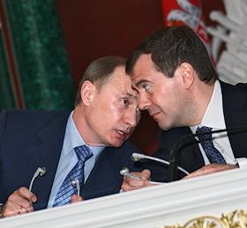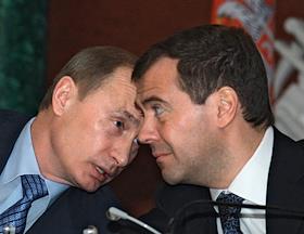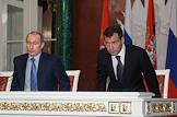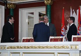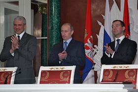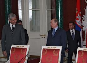 Президент России Владимир Путин (слева) и первый заместитель председателя Правительства России Дмитрий Медведев (второй справа) во время деловой встречи в Кремле с президентом Сербии Борисом Тадичем и председателем Правительства Сербии Воиславом Коштуницей. Россия и Сербия заключили стратегическое межправительственное соглашение в нефтегазовой сфере сроком на 30 лет. В присутствии президентов двух стран документ подписали министр промышленности и энергетики России Виктор Христенко (второй слева) и министр по инфраструктуре Сербии Велимир Илич.