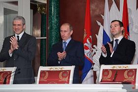 Президент России Владимир Путин (в центре), первый заместитель председателя Правительства России Дмитрий Медведев (справа) и президент Сербии Борис Тадич (слева) во время деловой встречи в Кремле. Темы встречи - проблема Косово, вопросы сотрудничества на международной арене, обмен мнениями по всему комплексу двусторонних отношений.