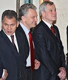Посол России в Сербии Александр Алексеев (справа), министр промышленности и энергетики России Виктор Христенко (в центре) и министр России по делам гражданской обороны, чрезвычайным ситуациям и ликвидации последствий стихийных бедствий Сергей Шойгу (слева) во время деловой встречи Президента России Владимира Путина с президентом Сербии Борисом Тадичем в Кремле. Темы встречи - проблема Косово, вопросы сотрудничества на международной арене, обмен мнениями по всему комплексу двусторонних отношений.