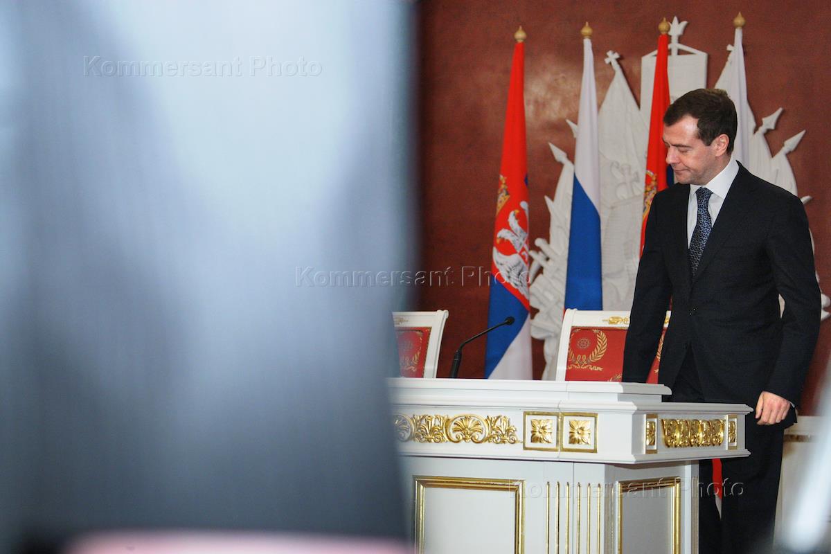 Первый заместитель председателя Правительства России Дмитрий Медведев во время деловой встречи Президента России Владимира Путина с президентом Сербии Борисом Тадичем в Кремле. Темы встречи - проблема Косово, вопросы сотрудничества на международной арене, обмен мнениями по всему комплексу двусторонних отношений.