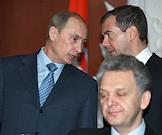 Президент России Владимир Путин (слева), первый заместитель председателя Правительства России Дмитрий Медведев (справа) и президент ОАО "Газпромнефть" Александр Дюков (в центре) во время деловой встречи с президентом Сербии Борисом Тадичем в Кремле. Темы встречи - проблема Косово, вопросы сотрудничества на международной арене, обмен мнениями по всему комплексу двусторонних отношений.