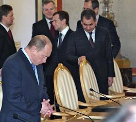 Министр иностранных дел России Сергей Лавров (справа), посол России в Сербии Александр Алексеев (второй справа), первый заместитель председателя Правительства России Дмитрий Медведев (в центре), министр России по делам гражданской обороны, чрезвычайным ситуациям и ликвидации последствий стихийных бедствий Сергей Шойгу (четвертый слева), полномочный представитель Президента России в Центральном федеральном округе Григорий Полтавченко (третий слева), глава РАО "Газпром" Алексей Миллер (второй слева) и президент ОАО "Газпромнефть" Александр Дюков (слева) во время деловой встречи Президента России Владимира Путина с президентом Сербии Борисом Тадичем в Кремле. Темы встречи - проблема Косово, вопросы сотрудничества на международной арене, обмен мнениями по всему комплексу двусторонних отношений.
