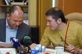 Президент компании "Евросеть" Алексей Чуйкин (слева) и председатель совета директоров компании "Евросеть" Евгений Чичваркин (справа) на пресс-конференции, посвященной итогам деятельности компании "Евросеть" и итогам развития рынка мобильных телефонов в России за 2007 год. Пресс-конференция прошла в офисе компании "Евросеть".
