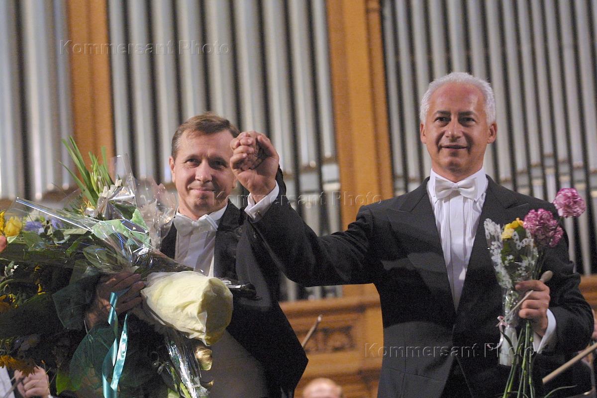 Дирижер Московской филармонии, композитор, пианист Михаил Плетнев (слева) и дирижер, художественный руководитель камерного оркестра "Виртуозы Москвы" Владимир Спиваков (справа) принимают аплодисменты публики после окончания концерта Национального оркестра в Большом зале консерватории.