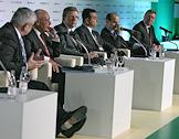 Президент Академии российского телевидения, телеведущий Владимир Познер (слева), министр финансов России Алексей Кудрин (третий слева), президент "Renault" Карлос Гон (третий справа), президент Коста-Рики (199-1998) Хосе Мария Фигейрес (второй справа) и председатель правления РАО "ЕЭС России" Анатолий Чубайс (справа) во время Форума "Россия". Форум прошел в Гостином Дворе.