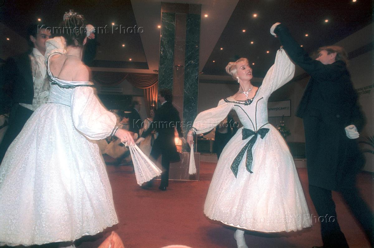 Первый московский благотворительный бал в пользу молодых артистов Большого театра в городском семейном клубе "Монолит". Корреспондент ИД "Коммерсантъ" Татьяна Кузнецова (слева) и руководитель мимического ансамбля Государственного академического Большого театра (ГАБТ), балетмейстер Юрий Папко (справа) во время бала.