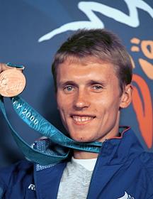 Член российской сборной по легкой атлетике Сергей Клюгин с золотой медалью после выступления на XXVII летних Олимпийских играх.