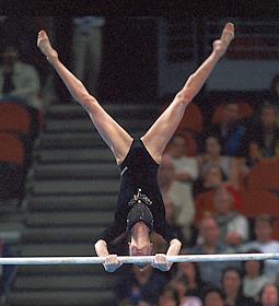 Участница олимпийской сборной России по спортивной гимнастике Светлана Хорхина выполняет упражнения на брусьях во время выступления на XXVII Олимпийских играх.