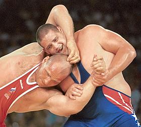 Трехкратный олимпийский чемпион по греко-римской борьбе Александр Карелин (слева) во время выступления на XXVII летних Олимпийских играх.