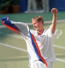 Член сборной России по теннису Евгений Кафельников во время матча на XXVII летних Олимпийских играх.