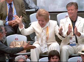 Заместитель Председателя правительства России по социальным вопросам Валентина Матвиенко (второй ряд, справа) и председатель депутатской группы "Народный депутат" Геннадий Райков (третий ряд, в центре) на трибуне среди болельщиков во время XXVII летних Олимпийских играх.