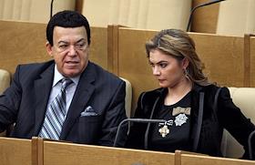 Член Комитета Государственной Думы России по информационной политике, информационным технологиям и связи Иосиф Кобзон (слева) и член Комитета Государственной Думы России по делам молодежи Алина Кабаева (справа) на заседании Госдумы.