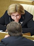 Заместитель председателя Государственной Думы России Любовь Слиска (слева) и член Комитета Государственной Думы России по информационной политике, информационным технологиям и связи Станислав Говорухин (справа) на заседании Госдумы.
