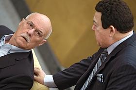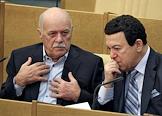 Член Комитета Государственной Думы России по информационной политике, информационным технологиям и связи Станислав Говорухин (слева) и член Комитета Государственной Думы России по информационной политике, информационным технологиям и связи Иосиф Кобзон (справа) на заседании Госдумы.