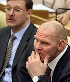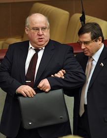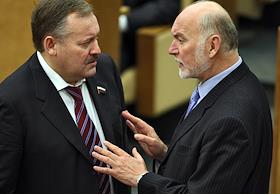 Член Комитета Государственной Думы России по международным делам Александр Карелин (слева) и председатель Комитета Государственной Думы России по безопасности Владимир Васильев (справа) на заседании Госдумы.