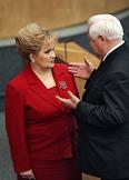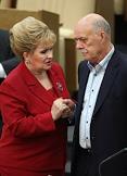 Заместитель председателя Государственной Думы России Любовь Слиска (слева) и председатель Комитета Государственной Думы по делам национальностей Валентин Купцов (справа) во время думского заседания.