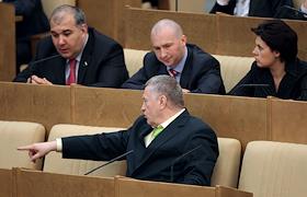 Лидер Либерально-демократической партии России (ЛДПР), заместитель председателя Государственной Думы России Владимир Жириновский (в центре в первом ряду) и руководитель фракции Либерально-демократической партии России (ЛДПР) Игорь Лебедев (в центре во втором ряду) во время думского заседания.