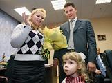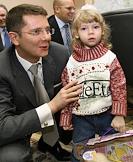 Российский Фонд Помощи (РФП). Девочка Рита Белоглазова (3 года) с родителями в гостях у депутата Московской областной Думы Сергея Жигарева (справа).