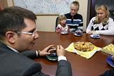 Российский Фонд Помощи (РФП). Девочка Рита Белоглазова (3 года) с родителями в гостях у депутата Московской областной Думы Сергея Жигарева (слева).