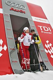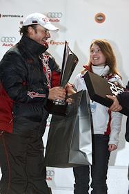 Музыкант группы "Браво" Александр Стапаненко (слева) на церемонии награждения победителей соревнований на Кубок "Audi" по горным лыжам в спортивно-развлекательном "Парке Яхрома". Александр Степаненко занял второе место на соревнованиях.