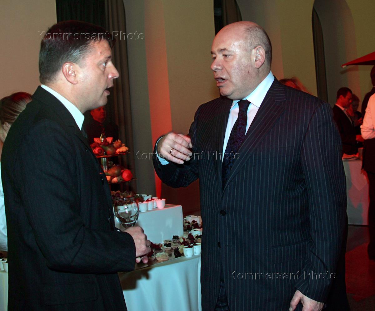 Руководитель Федерального агентства России по культуре и кинематографии Михаил Швыдкой (слева) и глава компании "Боско ди Чильеджи" в России Михаил Куснирович (справа) на торжественном приеме в честь открытия 175-ого сезона Михайловского театра оперы и балета (Санкт-Петербург) и дня рождения генерального директора театра Владимира Кехмана в Музыкальном театре имени К.С.Станиславского и В.И.Немировича-Данченко.