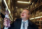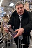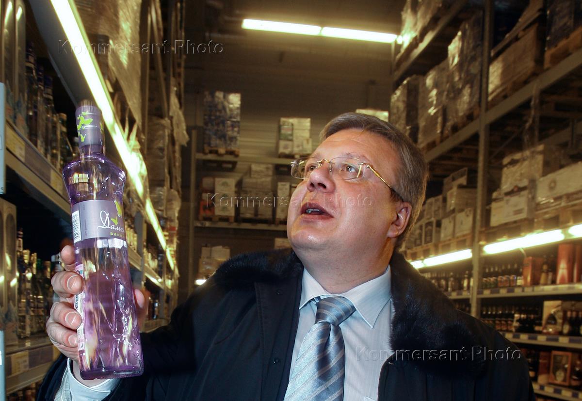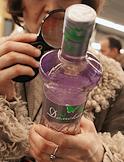 Покупательница рассматривает через лупу этикетку на бутылке водки "Дамская" компании "Дейрос" в гипермаркете "Метро" на Варшавском шоссе.