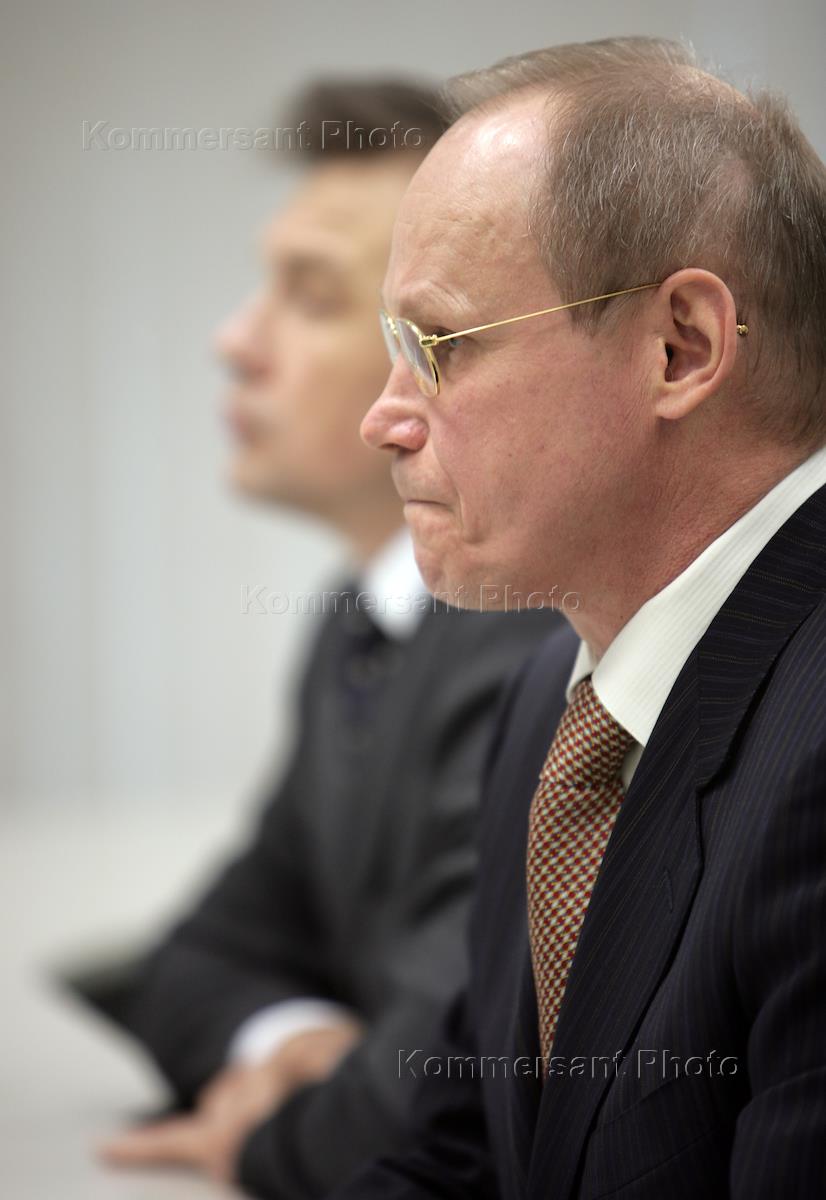 Генеральный директор Государственной корпорации "Агентство по страхованию вкладов (АСВ) Александр Турбанов (слева) во время пресс-конференции на тему "Итоги деятельности Агентства по страхованию вкладов в 2007 г. и вопросы развития системы страхования вкладов". Пресс-конференция прошла в агентстве "Интерфакс".