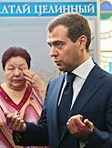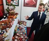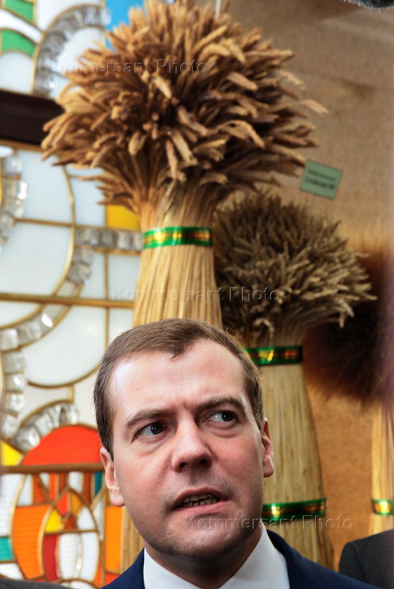 Первый заместитель председателя Правительства России Дмитрий Медведев во время осмотра выставки продукции предприятий Алтайского края. Выставка прошла в Алтайском краевом театре драмы имени Василия Шукшина.