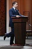 Первый заместитель председателя Правительства России Дмитрий Медведев во время встречи с первоцелинниками. Встреча прошла в Алтайском краевом театре драмы имени Василия Шукшина.