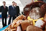 Министр сельского хозяйства России Алексей Гордеев (слева) и первый заместитель председателя Правительства России Дмитрий Медведев (в центре) во время осмотра выставки продукции предприятий Алтайского края. Выставка прошла в Алтайском краевом театре драмы имени Василия Шукшина.