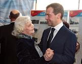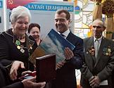 Первый заместитель председателя Правительства России Дмитрий Медведев (справа) во время встречи с первоцелинниками. Встреча прошла в Алтайском краевом театре драмы имени Василия Шукшина.