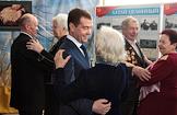 Первый заместитель председателя Правительства России Дмитрий Медведев (в центре) во время встречи с первоцелинниками. Встреча прошла в Алтайском краевом театре драмы имени Василия Шукшина.