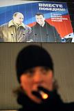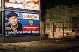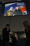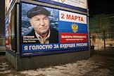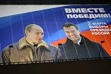 Агитационный плакат к выборам Президента России с портретами Президента России Владимира Путина и первого заместителя председателя Правительства России Дмитрия Медведева на гостинице Москва.