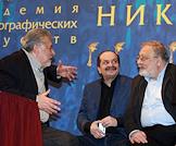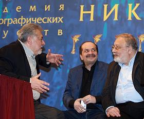 Кинорежиссер Юлий Гусман (слева), сценарист Александр Миндадзе (в центре) и писатель и сценарист Рустам Ибрагимбеков (справа) во время заседания Академии кинематографических иcкусств "НИКА", где прошло объявление номинантов XXI премии "НИКА". Заседание прошло в Центральном Доме архитекторов.