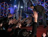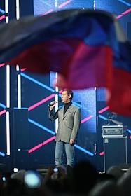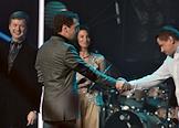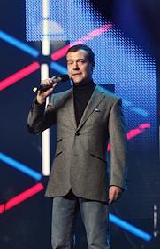 Первый заместитель председателя Правительства России Дмитрий Медведев (в центре), телеведущий Валдис Пельш (слева) и солист группы "Любэ" Николай Расторгуев (справа) во время выступления на всероссийском спортивном форуме "Россия, вперед!"