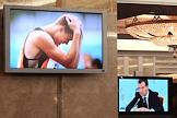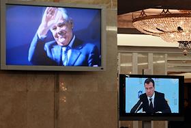 Первый заместитель председателя Правительства России Дмитрий Медведев (на экране монитора справа) на совещании по развитию массового спорта.