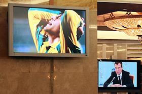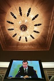 Первый заместитель председателя Правительства России Дмитрий Медведев (на экране монитора) на совещании по развитию массового спорта.