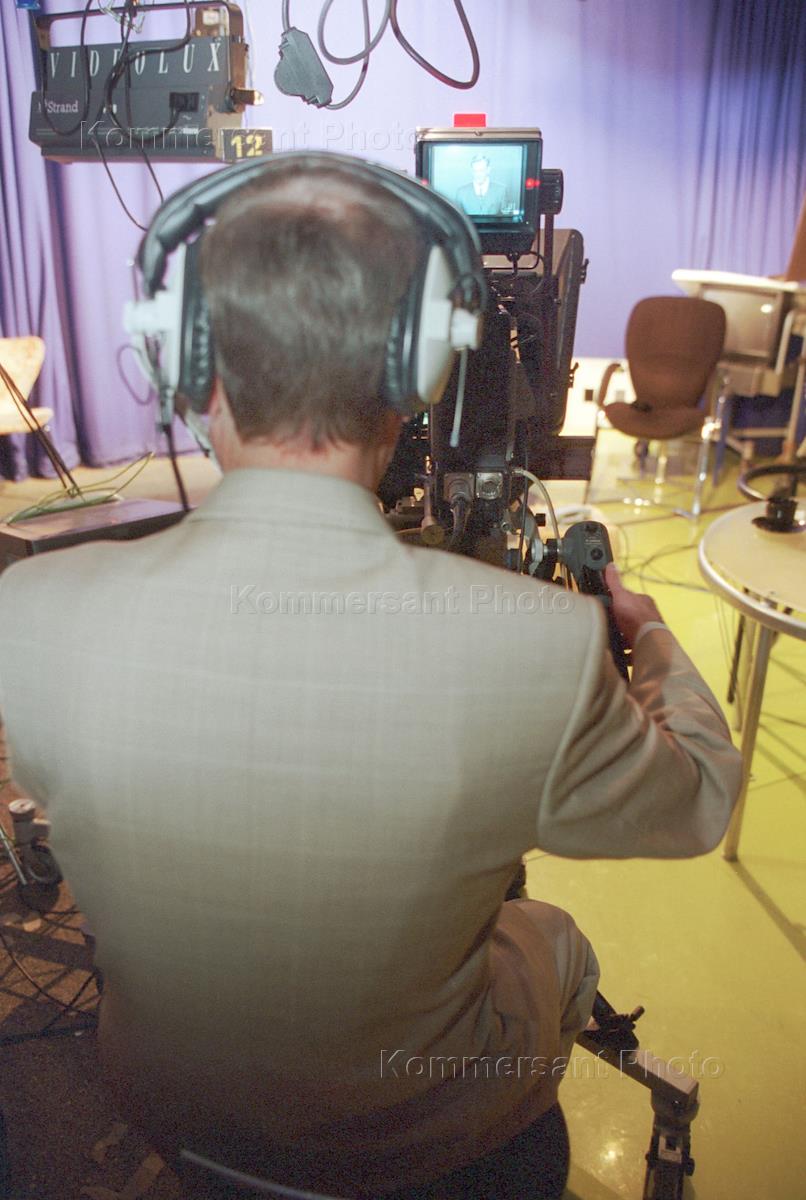 Оператор за камерой во время работы в студии телеканала НТВ.