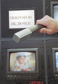 Телекамера и табло "Микрофон включен" в студии канала НТВ.