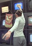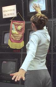 Девушка вытирает пыль с мониторов в студии телеканала "НТВ". Табличка "Микрофон включен" и вымпел "Победителю социалистического соревнования".