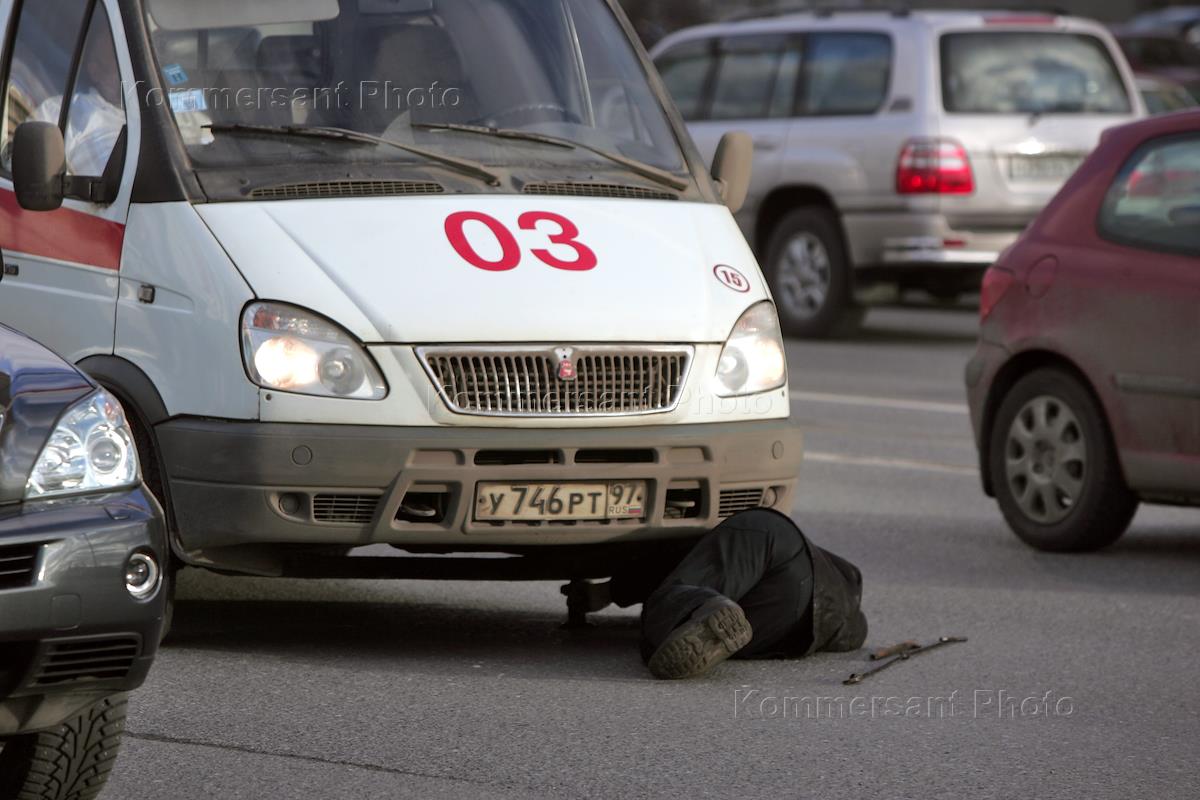 Водитель машины "скорой помощи" во время ремонта автомобиля на дороге.