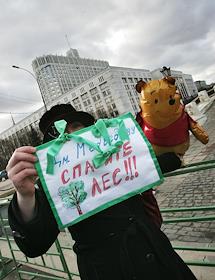 Митинг на Горбатом мосту против строительства платной дороги в Химкинском лесу. Участник митинга держит плакат "Дм. Медведеву. Спасите лес !!!"