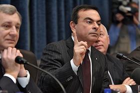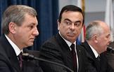 Председатель Федерального агентства России по промышленности Борис Алешин (слева), президент автоконцерта "Renault" Карлос Гон (в центре) и председатель Совета директоров Группы компании "Тройка-Диалог" Рубен Варданян (справа) на подписании соглашения о покупке компанией "Renault" пакета акций ОАО "АвтоВАЗ". Подписание прошло в здании "Рособоронэкспорт".
