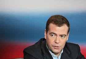 Кандидат на пост Президента страны, первый заместитель председателя Правительства России Дмитрий Медведев на пресс-конференции в своем избирательном штабе.
