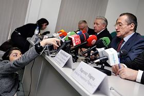 Депутат Европейского парламента (Франция) Поль-Мари Куто (справа) на пресс-конференции наблюдателей из европейских стран, посвященной президентским выборам в России. Пресс-конференция прошла в центральном офисе агентства "Интерфакс".