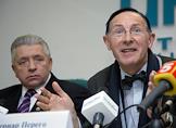 Бывший вице-премьер Польши Анджей Леппер (слева) и вице-мэр города Сент-Уэн (Франция) Бернар Перего (справа) во время пресс-конференции наблюдателей из европейских стран, посвященная президентским выборам в России. Пресс-конференция проводилась в центральном офисе агентства "Интерфакс".